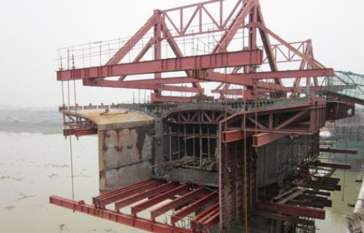 掛籃是滑動(dòng)或滾動(dòng)的承重構(gòu)架,錨固在橋梁上,含有行走軌道。在掛籃上可進(jìn)行模板、鋼筋、預(yù)應(yīng)力管道的施工,混凝土灌注和預(yù)應(yīng)力張拉,壓漿等作業(yè)。完成一個(gè)節(jié)段的循環(huán)后,掛籃即可前移并再次固定,進(jìn)行下一階段的懸澆。一直到主跨完成并且合攏;
